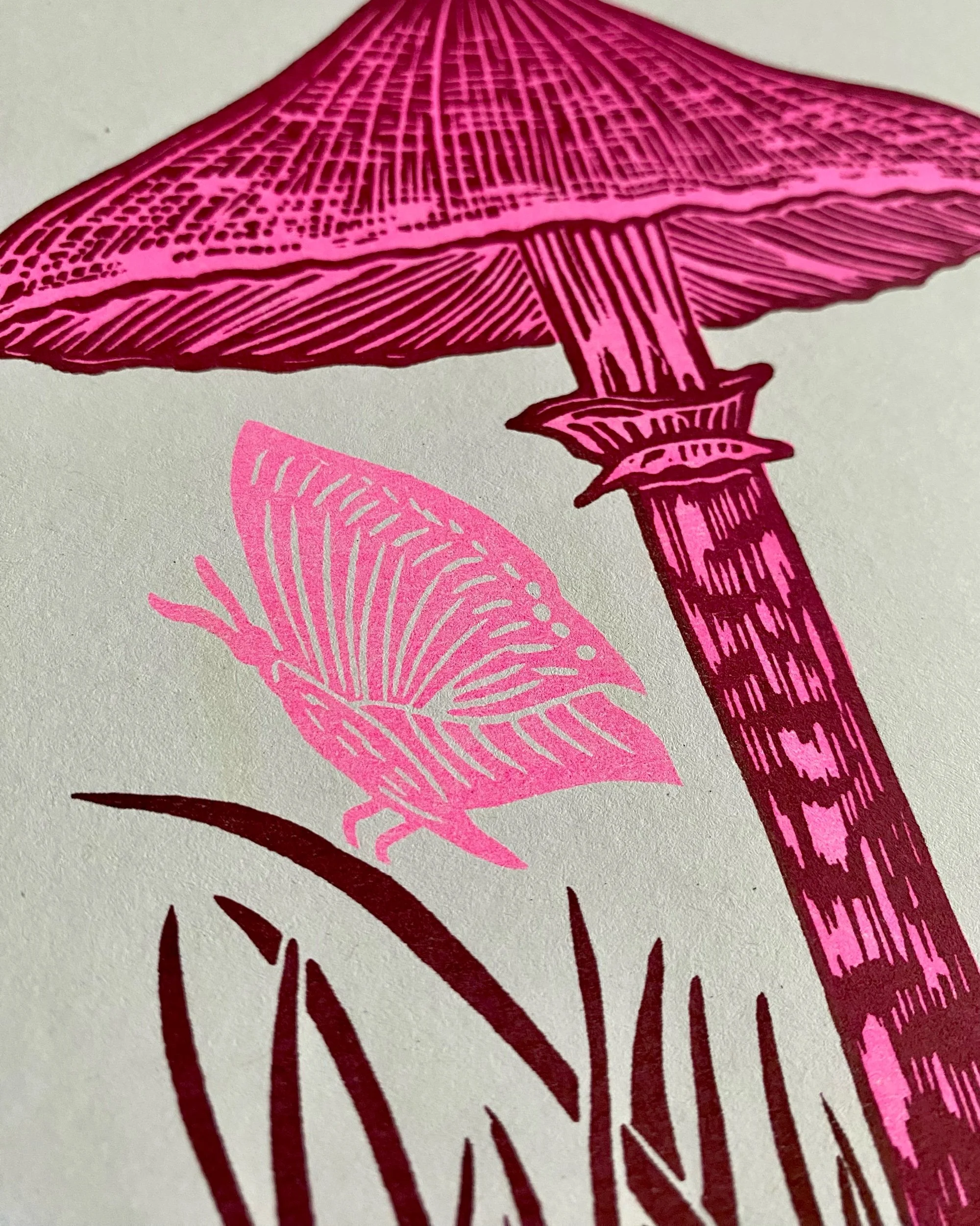 A beautifully Risograph printed burgundy and neon pink A4 print of my original linocut of a parasol mushroom and moth. Image size fits an 8x10” frame but print is A4. Posted flat.